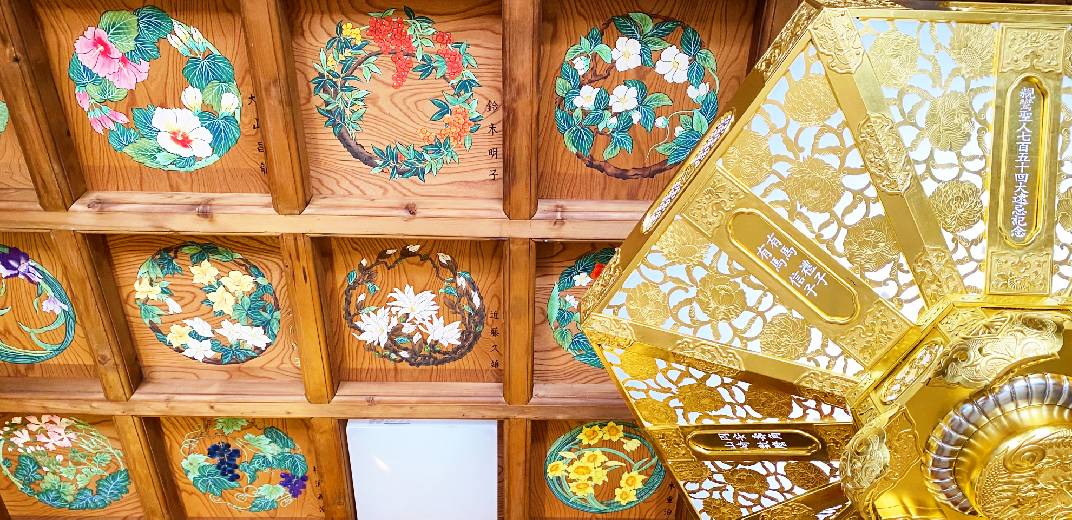 本堂に足を踏み入れたら、ぜひ天井を見上げてみてください。色鮮やかな花々が描かれた「花の天井画」を見ることができます。