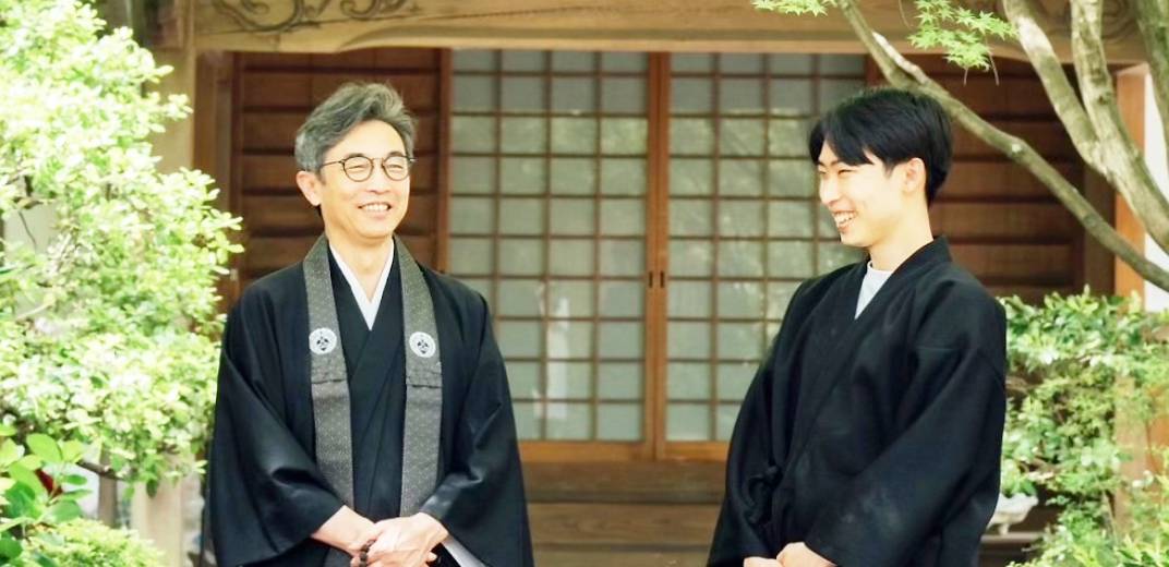 向かって左側が現在の住職・西脇顕真(けんしん)さん。33代目としてお寺を守っていらっしゃいます。息子であり副住職でもある唯真(ゆいま)さん(写真右) は、仏教の勉強をしながら住職の見習いとしてお勤めです。お寺のSNSを活用し、積極的に情報を発信しています。