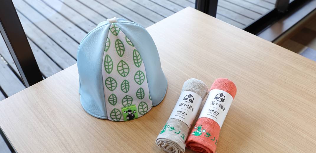茶の湯ではオリジナルのサウナハット(全4色、3,700円・税込)やタオル(1,100円・税込)も販売中。お茶の葉っぱをモチーフにした柄がとてもキュート!サウナハットは、熱から髪を守る効果があるそうです。