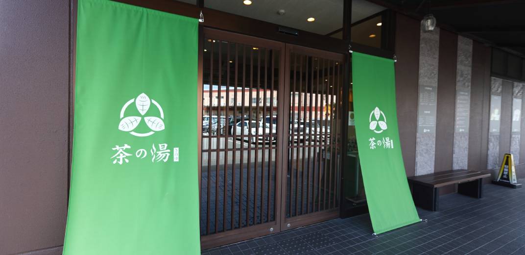 建物の目印は、大きな「〇サ」の看板!遠くからでもバッチリ目立っているので、迷う心配はありません。建物やのれんは「茶の湯」の名前の通り抹茶色で統一。落ち着いた雰囲気ですね。