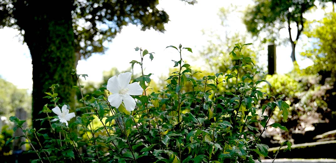 訪れた8月末には、白いムクゲの花が咲いていました。椿や桜、あじさいといった四季折々の植物が境内を彩ります。