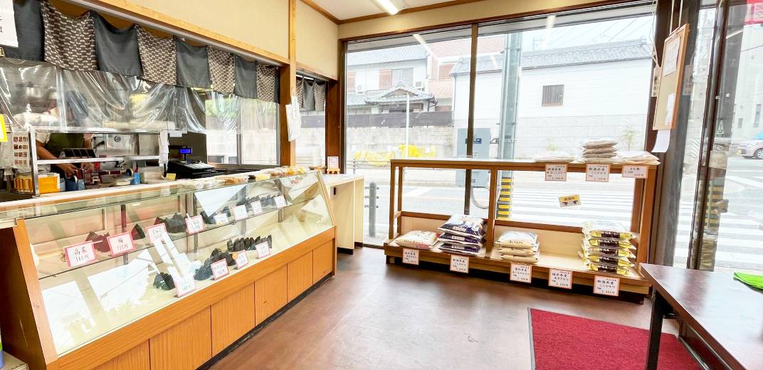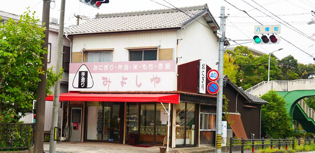 刈谷市の亀城公園にほど近い「みよしや八幡店」。おにぎりやお弁当、秋祭りの投げもちをはじめとするおもち各種、和菓子などを製造・販売しています。