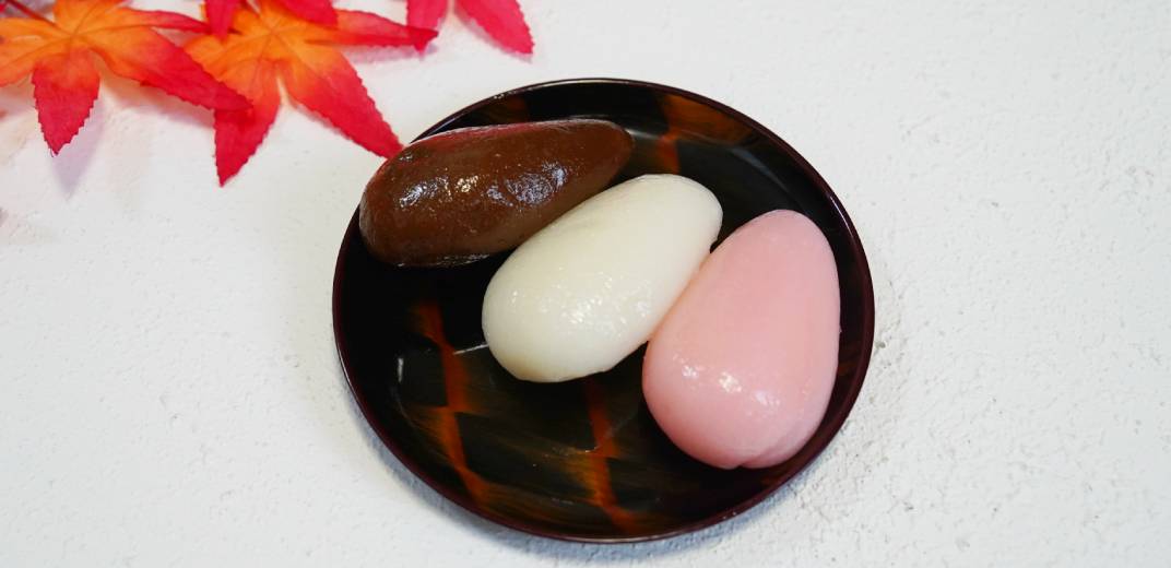 もっちりやわらかな食感が特徴の、このお月見だんご。みよしやでは、お花見の三色だんごに近いレシピで作っています。