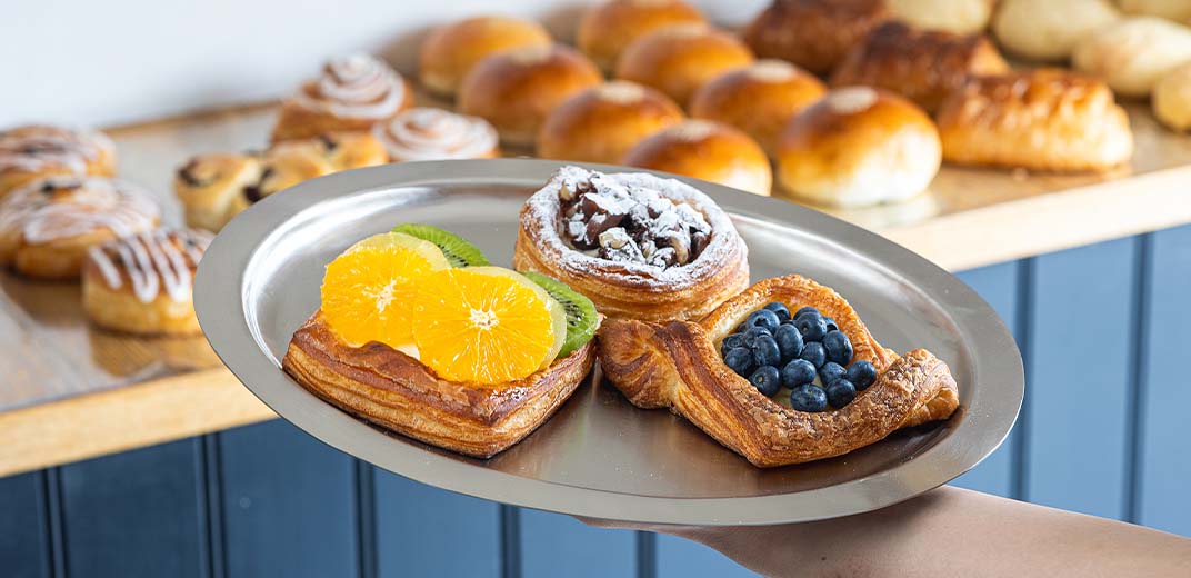 総菜パンや菓子パンだけでなく、食パンやフランスパンの種類も豊富な「Bakery Dooku」。バターの香りとサクサクの食感が自慢のデニッシュも大人気!
