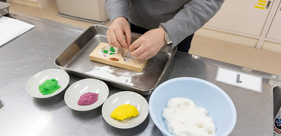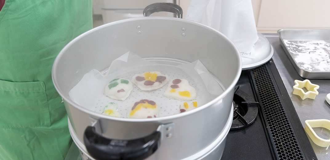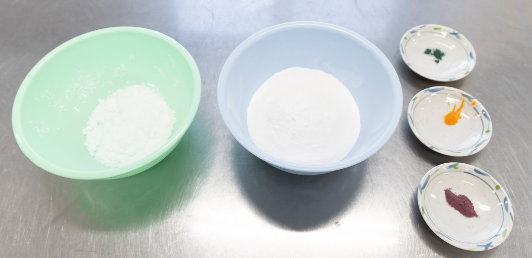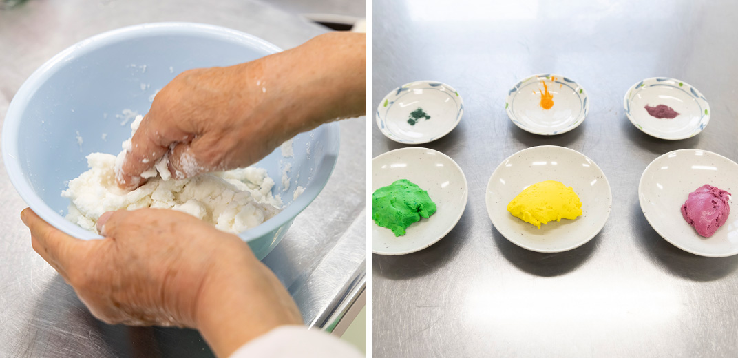次に、食紅と米粉を混ぜて、色付け用の生地を作ります。蒸し上がると色が濃くなるので、食紅の量を調整しながら入れるのがおすすめ。ポイントは「生地の固さを本体生地よりも少しゆるめにすること。自由に形を調整できるので色付けがしやすくなります」と古居さんが教えてくれました。