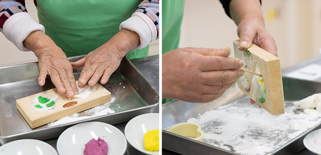 打ち粉を木型に広げたら、まず着色した生地を色付けしたい部分に置いていきます。古居さんのアドバイスの通り、少しゆるめに練った生地は、丸めたり、細長い棒状にしたり…と扱いやすいです。出来上がりをイメージしながら並べますが、思っている場所にうまく置けず難しい……!