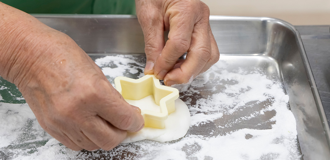 木型がない場合は、クッキーの型を使うこともできます。本体生地を薄く伸ばし、クッキーの型で型どり、色付けした生地をのせ、手のひらを使って均一の厚さにします。