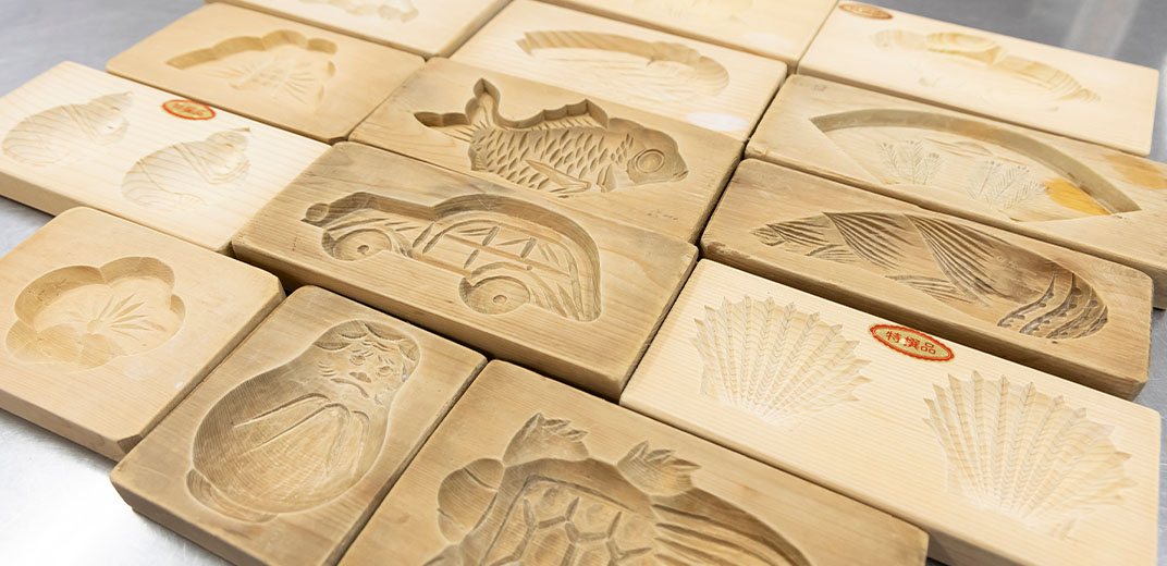 おこしものの木型には、桜や梅など花の形をはじめ、富士山、松の木、鯛、宝袋など縁起物のモチーフがあります。最近では蝶や自動車の形も作られているそう。