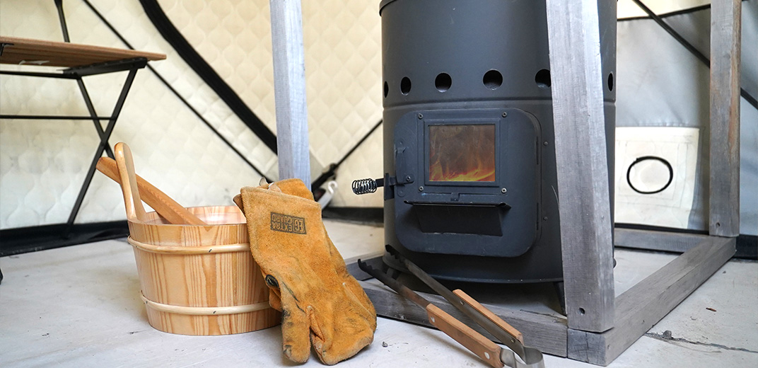安正寺のテントサウナは、断熱性の高いキルト生地で狭い空間を包んでいるので100度以上をキープすることもできるんだとか。