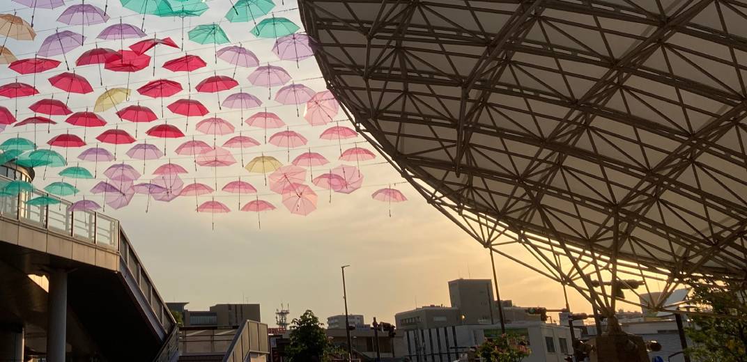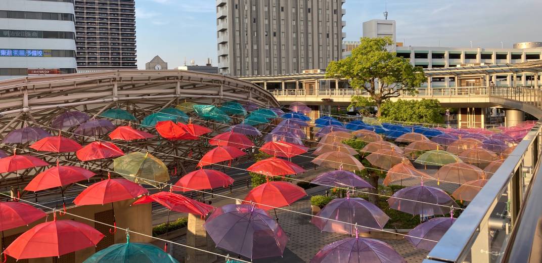2022年、JR・名鉄刈谷駅前で開催された「カリアンブレラ」。刈谷駅南口のみなくる広場を色とりどりの傘、北口をカラフルな風船が彩りました。