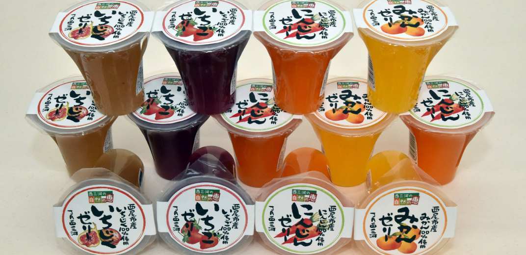 100%西尾市産のいちじく、いちご、にんじん、みかんの果汁をたっぷり使って作られたフルーツゼリーは、夏の贈り物の定番として親しまれています。なかでも一番人気はいちごで、老若男女から愛されるお味だそう。「冷蔵庫で冷やしてそのまま食べるのが一番おいしい」という声に加え、「暑い日は冷凍してシャーベットにしてもおいしい」という声も!