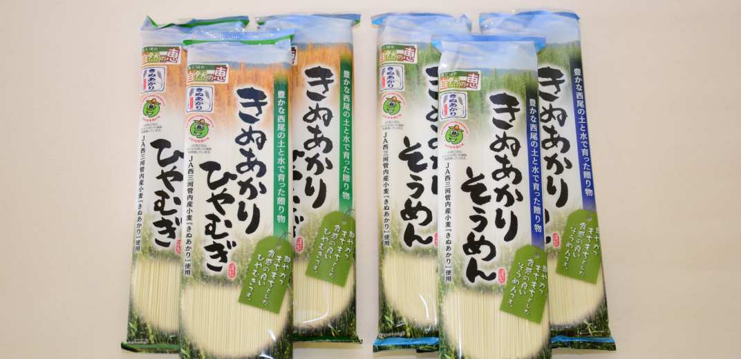 西尾市は小麦の生産面積および出荷量が愛知県内の市町村別でもっとも多く、一大産地として有名です(2023年度実績)。そんな西尾市でとれた小麦「きぬあかり」を使ったひやむぎ・そうめんは、もっちりとコシのある食感に仕上がることで知られています。風通しがよく、直射日光が当たらない暗所で保存するのが◎