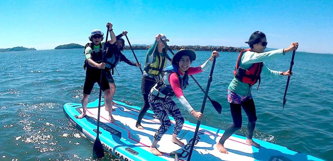 巨大サップは、みんなで協力して海上を進む楽しさが魅力のマリンスポーツ。ワゴン車くらいの大きさのボードに乗れば、気分は一気に探検隊。息を合わせて漕いでいるうちに、自然とチームワークや絆も強まりそう。自分たちの手で重い水を掻き、雄大な自然を眺めているうちに、自然と溶け合うような一体感が感じられます。