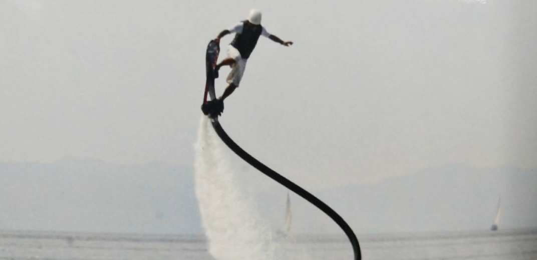 海上からジェットで浮き上がり、スノーボードのトリックを決めるようなパフォーマンスが特徴のホバーボード。体験では、水の上をジェット付きのボードで滑走するところからスタートします。その後ボードの扱いに慣れてきたら、水圧を上げて自由な空へ。平均的には1~2mくらい浮かび上がれる人が多いそうです。