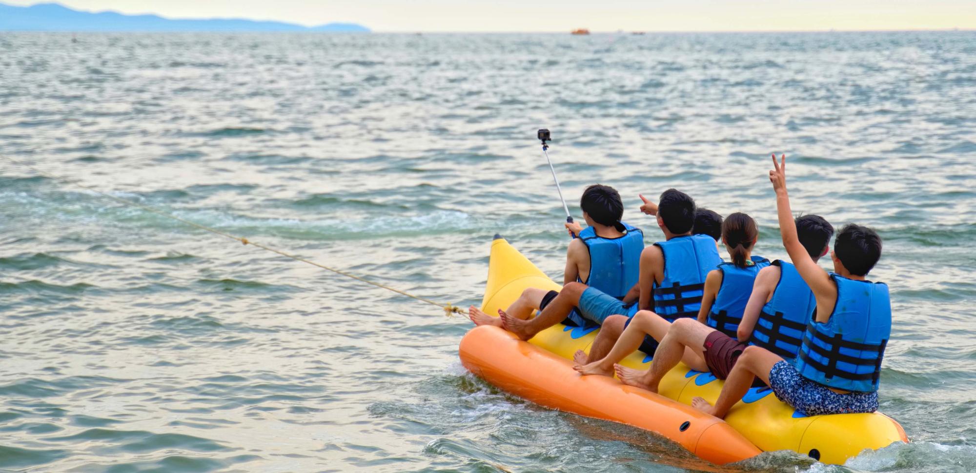 マリンスポーツの定番として、旅行雑誌やTVなどでもたびたび目にするバナナボート。モーターボートなどに引っ張られながら、水しぶきを浴びて海を滑走する爽快感は格別です。楽しみの核となるのは、みんなでバランスを取らなければボートごと倒れてしまうこと。声を合わせて「右、左」と体を動かし、一体感を楽しむのも醍醐味の一つです。勢いよく海に放り出されるのが楽しくなる利用者の人も多いんだとか。