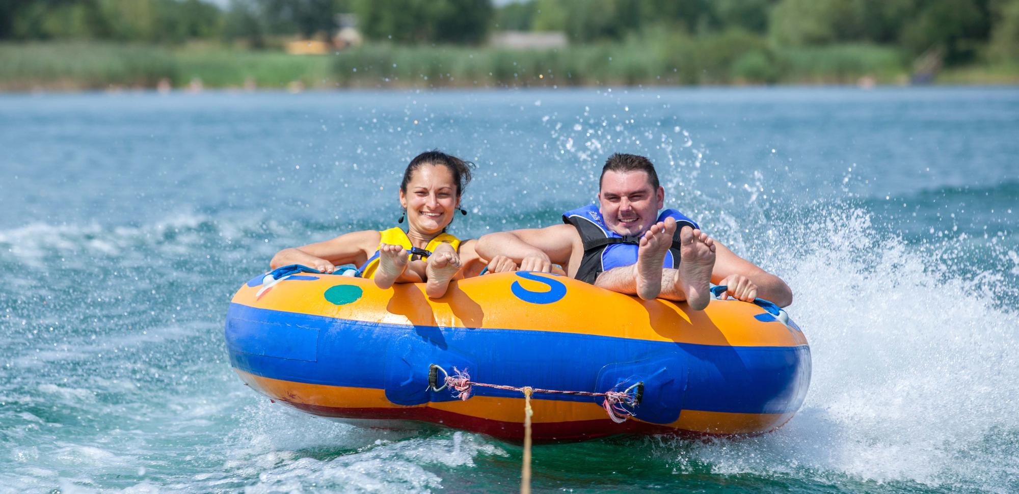 ドーナツ型の丸いボートに乗って海上を滑走するドーナツチューブ。バナナボートに比べ、上下左右に激しく揺さぶられるよりスリリングな体験が楽しめます。吹き飛ばされまいと踏ん張る利用者と、ギリギリを攻めるインストラクターの駆け引きも面白いところ。