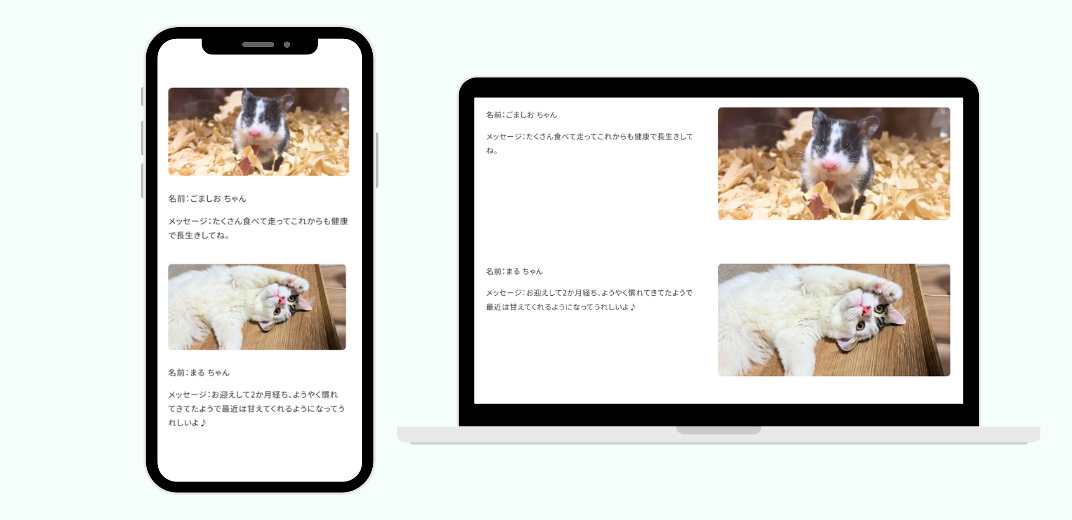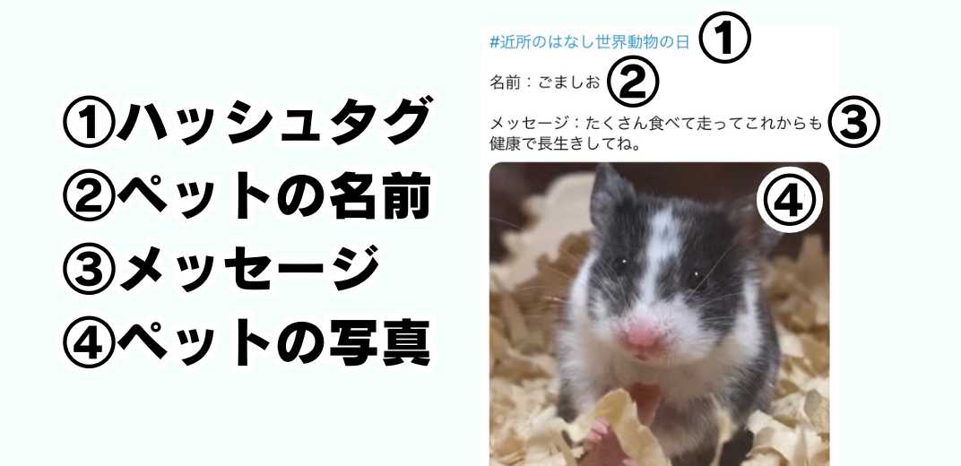 ハッシュタグ「#近所のはなし世界動物の日」、ペットの名前、ペットへのメッセージ、ペットの写真です。