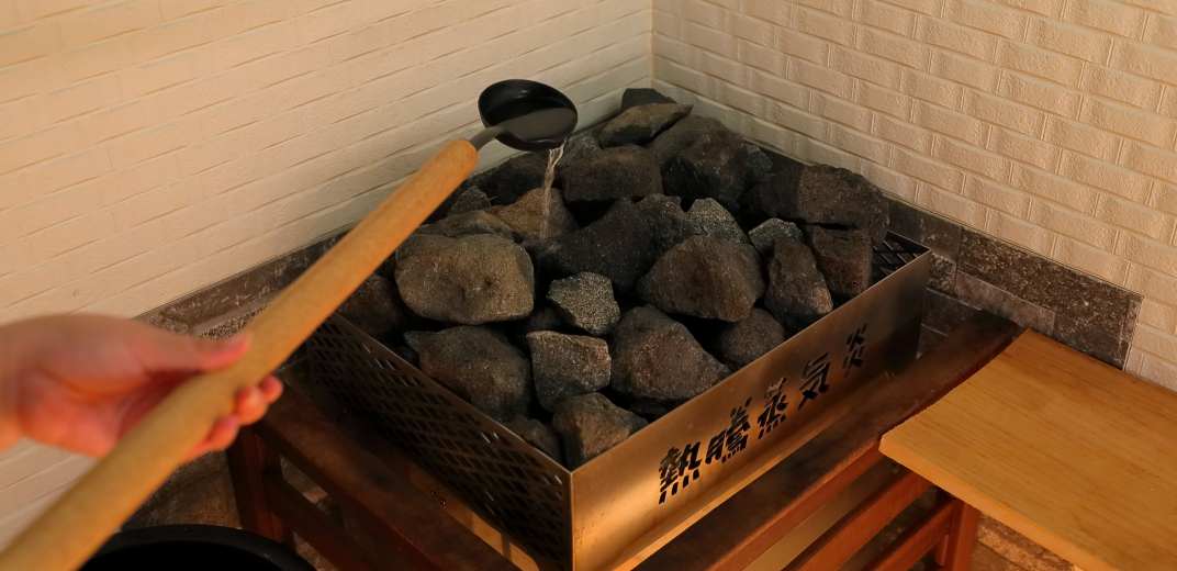 サウナ室の中にはセルフロウリュ用のストーブがあり、3回までロウリュが可能です。サウナストーンは天然溶岩石。アロマウォーターをかけると「じゅわ~」という音と共に水蒸気が勢いよく発生します。あつい…。ラドル(ひしゃく)の持ち手が長いので、ベンチ上段に座ったままのロウリュも可能。「わかってる」感じですね。