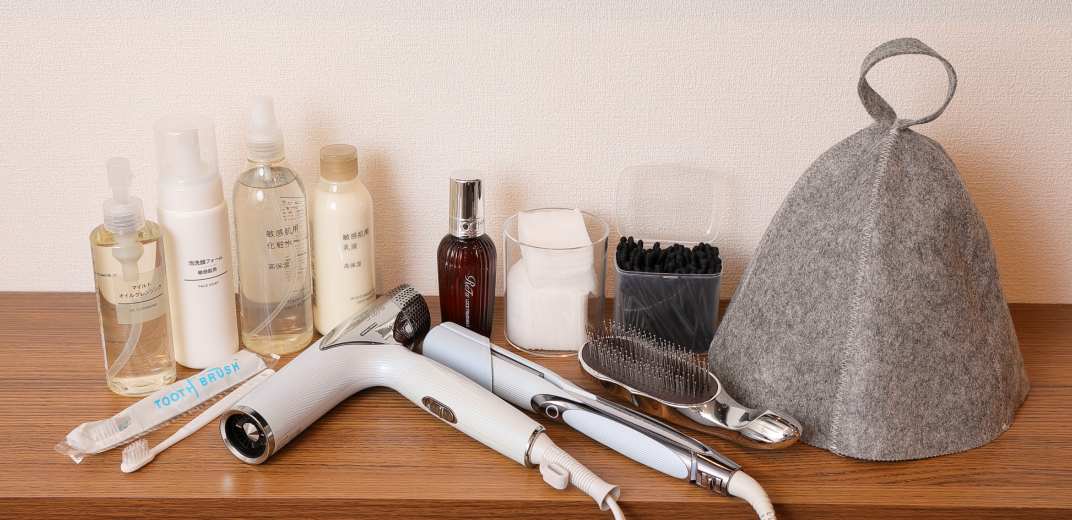 たるむでは、細部にもサウナー高評価ポイントがいっぱい。ドライヤーやヘアブラシはReFa、化粧水などのコスメは無印良品。紙パンツ、紙ブラ、コットン、綿棒、使い捨て歯ブラシまであって至れり尽くせりです。サウナハットやポンチョ、追加のバスタオルは有料です。