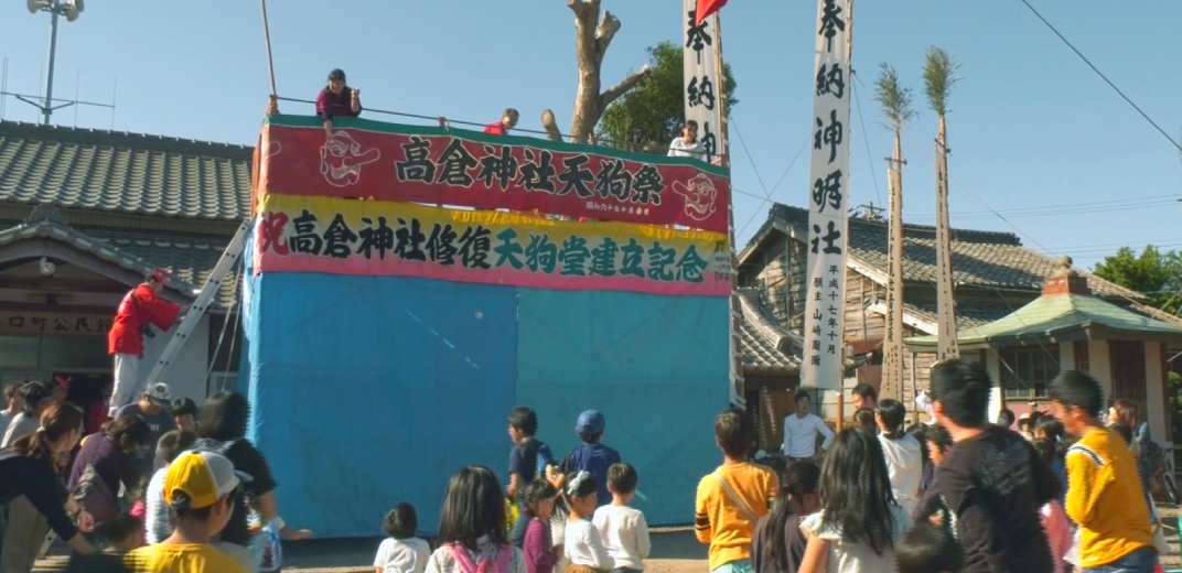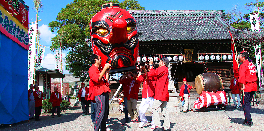 高倉神社の「天狗祭」は昭和59年に高さ1.65mの大天狗が納まる三河大天狗堂の完成により始まった比較的新しいお祭り。赤装束に赤面の厄男たちが大天狗のみこしを担いで町をねり歩いたり、境内を回ったりして、学業成就・夫婦円満・交通安全を祈願します。