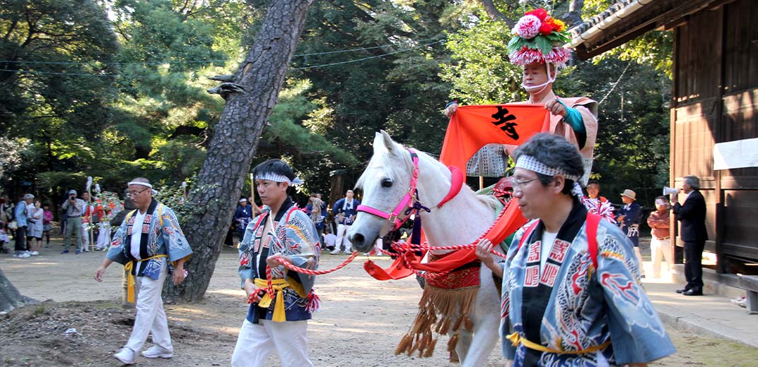 西尾市吉良町の瀬門神社で行われる祭礼。地元の人たちが、花笠をかぶった騎人を乗せた飾り馬を奉納します。