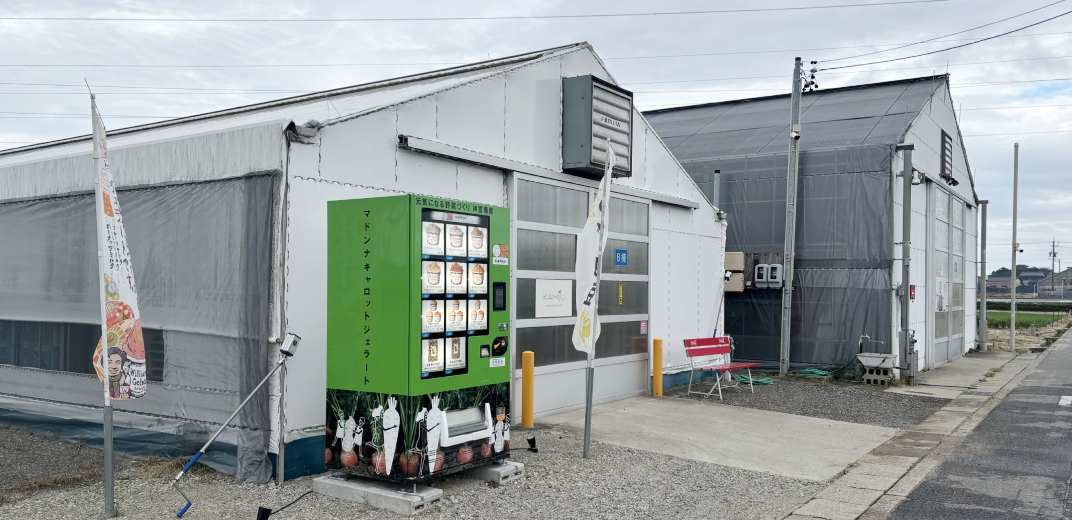ビニールハウスや畑などがひろがる碧南市大堤町。周りの風景からか、遠くからでも見つけやすい黄緑色の自販機で販売されているのは、市内の農園「神重農産」が育てた野菜などを使った「ジェラート」です。西尾市のジェラート専門店「ウィリアムズジェラート」とコラボした商品を販売しています。