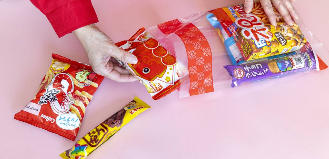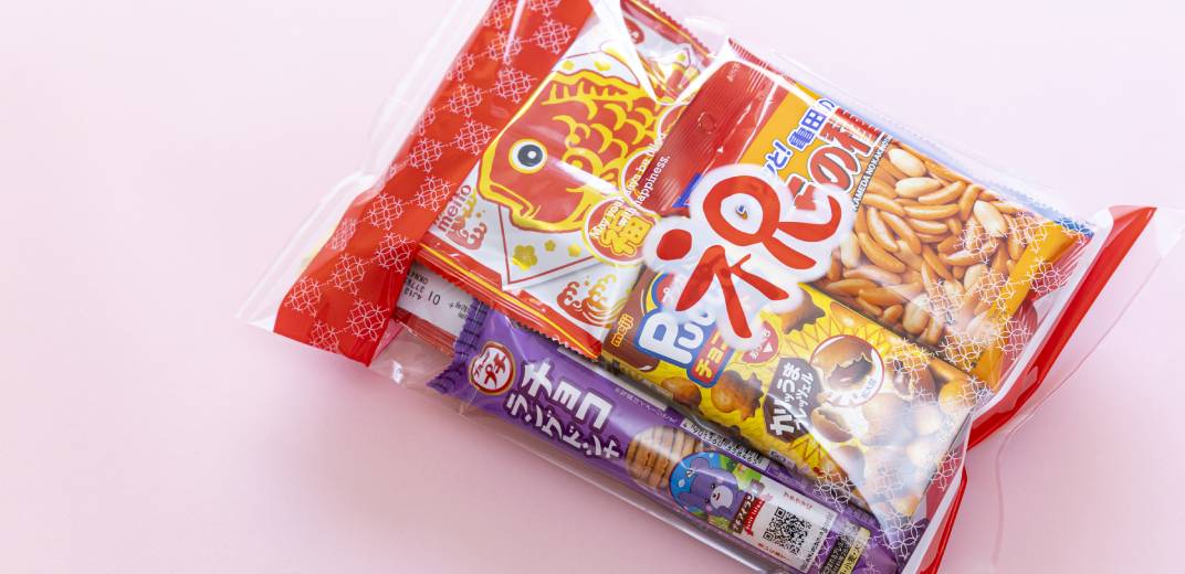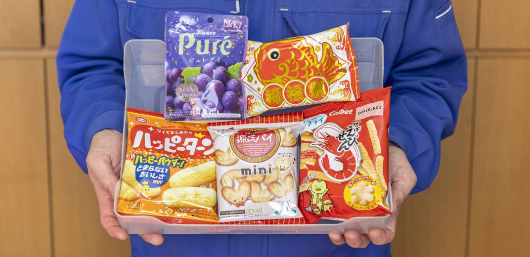 詰め合わせるお菓子は基本的に何でも良いのですが、お任せと言われた場合は縁起の良さそうなものを選ぶそう。鯛や海老の絵が描かれている「ふくふくたい(福福鯛)」や「かっぱえびせん」は嫁菓子の定番。他には「幸せ」が名前にある「ハッピーターン」、パッケージにハートモチーフがある「ピュレグミ」やハート型の「源氏パイ」など…。