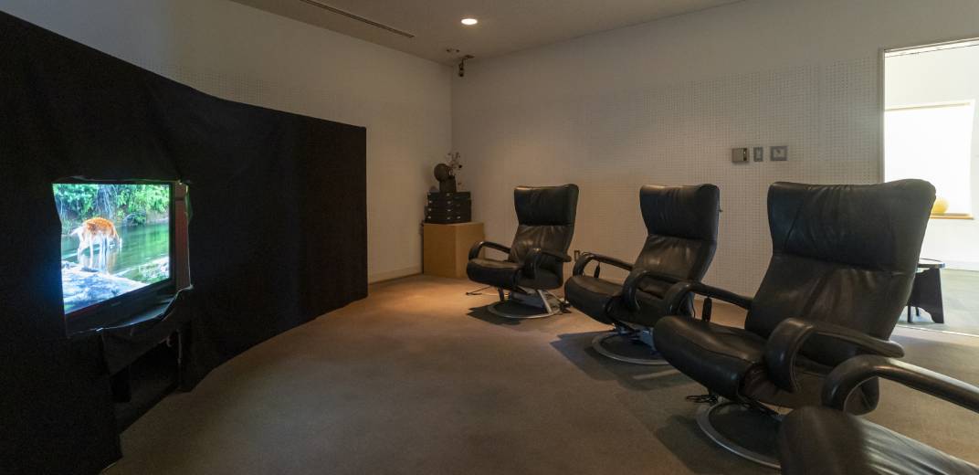 こちらはリラクゼーション・ルームです。音の振動を体全体に伝える「ボディソニック」が4台置かれており、自然の映像や環境音楽を楽しむことができます。座ってみると、リクライニングができて、ふっかふかな座り(寝)心地。