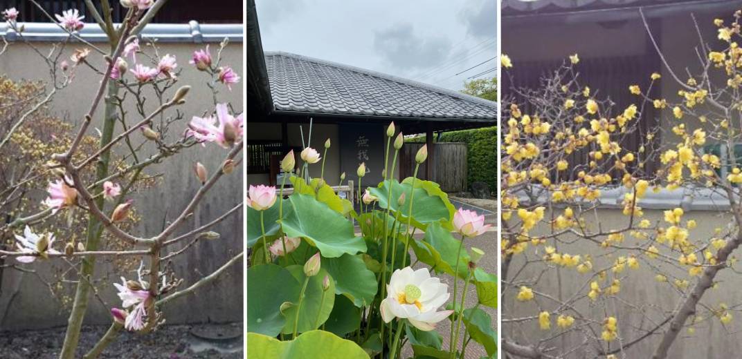 季節ごとに咲く花々も、無我苑の見所の一つ。さまざまな植物があちこちに植えられているので、いつ来ても違った表情が楽しめます。写真は左から、3月頃に咲くコブシ、6月頃に咲く蓮、2月頃に咲くロウバイです。他にもアサザやボケ、ユリ、山法師、南天などバラエティ豊か。庭を散策するだけでも、大人の休日にぴったりです。(取材:河合春奈/2024年12月取材、2025年6月情報確認)