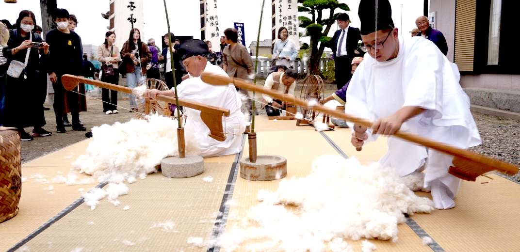 その後、訪れた人たちが見守るなか伝統的な道具を使った「棉打ち」と呼ばれる儀式が行われました。