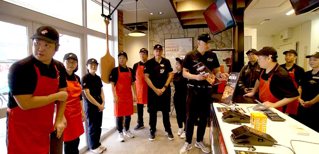 オープン前。ドミノ・ピザ刈谷稲場町店にドミノ・ピザ・ジャパンのCEOをはじめとした役員6人や本社のスタッフが集まりました。スーツではなく、それぞれ店員の格好でオープン前に実施している朝礼に参加し、その日の目標などを確認しました。CEOのマーティン・スティーンクスさんも「売り上げ活動はもちろん、楽しい活動をしていこう!」と伝えていて役員らはやる気いっぱいの様子でした。