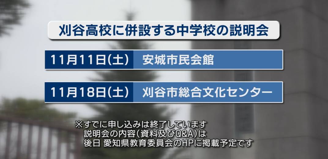 今年度は、2025年4月開校の第一次導入校4校の児童・保護者説明会が実施されます。刈谷高校に併設する中学校の説明会は、11月に2回、実施されます。