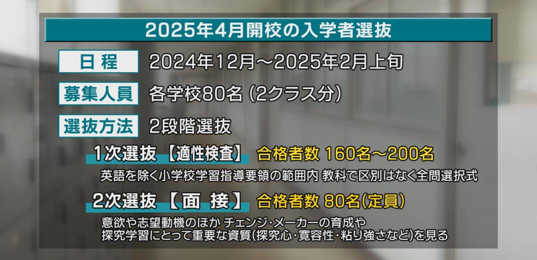 入学者の選抜方法については、入学後の学習に必要な資質や能力を丁寧に見るため、適性検査で思考力や判断力などを測り、受験者数を絞った上で面接を行う「2段階選抜」で実施されます。