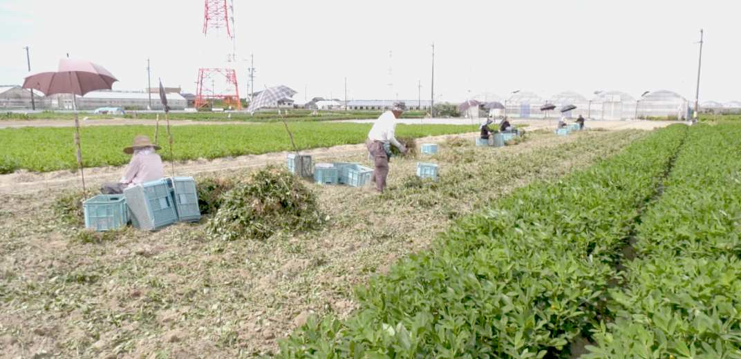 碧南市大堤町にある山田農園 山田浩孝さんの畑では、7月上旬から生ラッカセイの収穫が始まり、最盛期を迎えています。