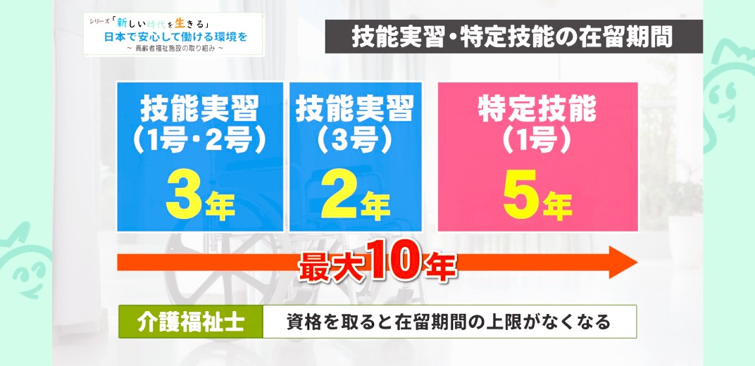 国家資格である介護福祉士をとると、日本での在留期間に上限が無くなり、長く働けるようになります。日本語で行われる介護福祉士の試験に合格するためには、日本語の習得が必要なのです。