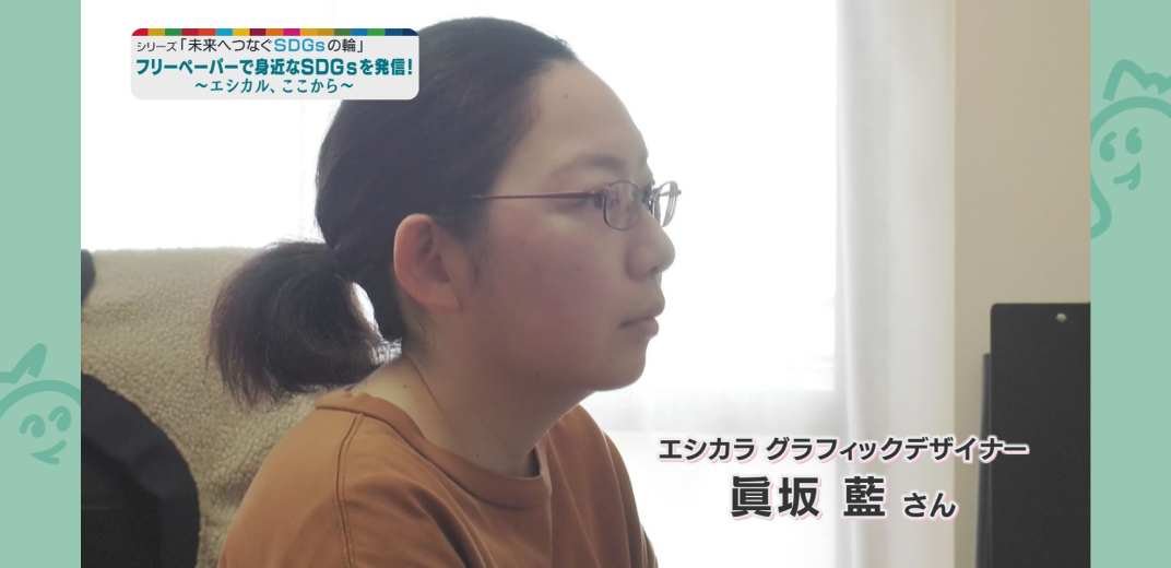 フリーランスのグラフィックデザイナーとして活動する傍ら「エシカル、ここから」の制作に打ち込んでいるのは、愛知県安城市に住む、眞坂藍さんです。「何か問題があって、それを解決するためにどうするかというと、どうしても暗い話が多くなってしまいます。楽しい内容かな、って思ってもらえるように考えて作っています」と、紙面の制作にあたって心掛けていることを教えてくれました。