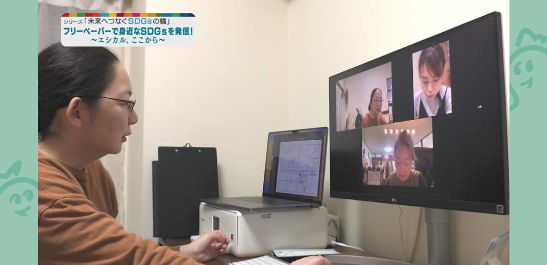 眞坂さん親子は、次の紙面づくりに取り掛かっています。この日はボランティアで手伝ってくれている友人も交え、ウェブ会議が行われました。治子さんからは「エアコンを適切に使って快適な家にする」という意見が出され、エシカルな住宅をテーマに紙面を作るアイデアについて3人で話し合いました。