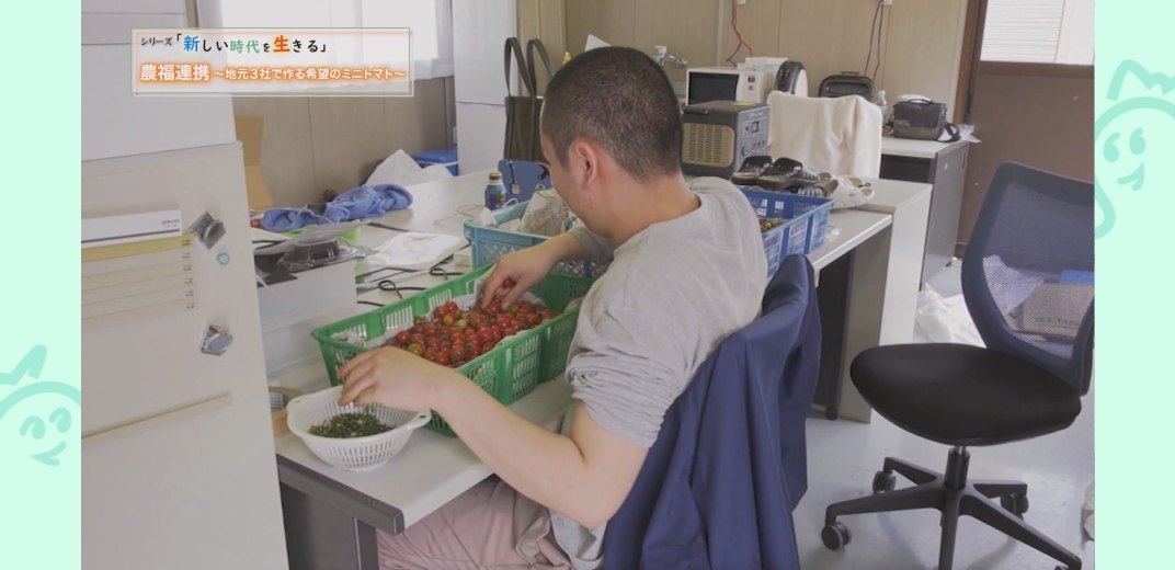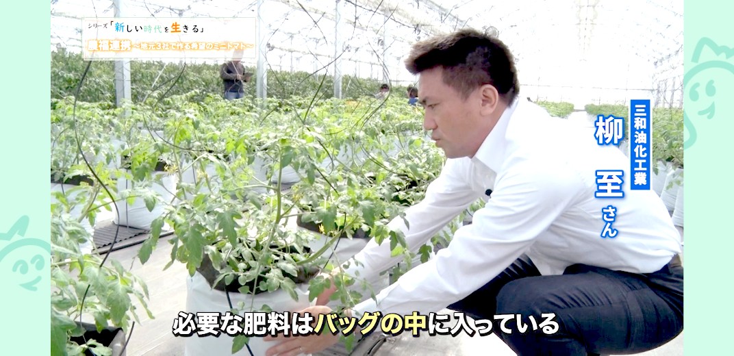 農業経験のない三和油化工業は川上農園からバッグ栽培のノウハウを学び、安定した生産量と美味しさを両立したミニトマトの栽培を始めました。そしてさらに生まれた新たなつながりについて、柳さんに教えてもらいました。「バッグ栽培は農作業を細分化できて、しかもその作業は簡易的です。1年を通しての生産も計画立ててできる栽培方法なんです。これは障がい者の方たちにも向いている環境だということで、地元で障がい者の就労支援をしている団体に声をかけさせてもらったところ、パンドラの会さんが手を挙げてくれました」