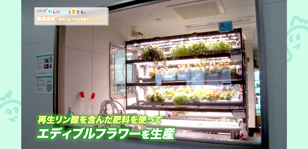 三和油化工業では液晶や半導体の製造過程で発生するリン酸を分離回収し、再生リン酸として取り出しています。リン酸は農作物の肥料の原材料としても使われており、三和油化工業でも再生リン酸を使った肥料づくりを行っています。現在はこの再生リン酸を含んだ肥料を使い、自社の工場で食用の花であるエディブルフラワーの生産、販売を開始しています。より良い肥料を作るために、本格的に農作物を自分たちで育ててみようと始めたのが、このミニトマト農園です。