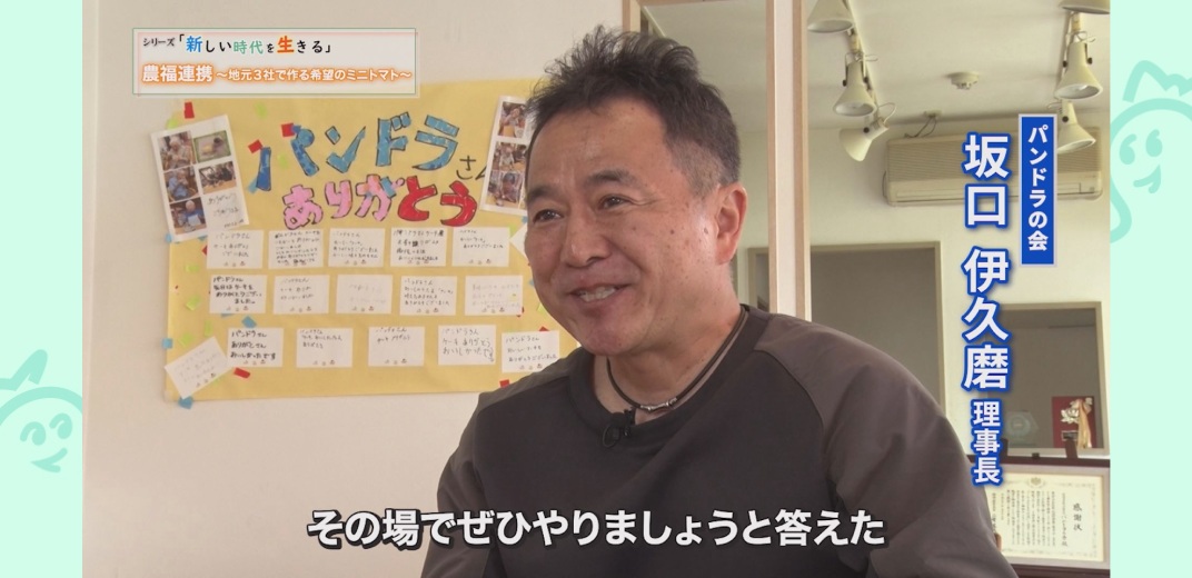 ミニトマトの管理を障害のある人たちに任せることで、新たな雇用を生むことができないか。この農福連携の取り組みに対して名乗りをあげたのは、刈谷市で障がい者の就労や自立の支援を行う、認定NPO法人パンドラの会でした。なぜ連携を決めたのか、パンドラの会の坂口伊久磨理事長にうかがいました。「本気で商売としても農業をやっていきたい、そして地域貢献もしたいという思いを聞いて、共感しました。こちらが障害のある方の仕事の話をした際には、『双方がwin-winになるようにやっていきましょう』と言ってもらい、その場でぜひやりましょうと答えました」