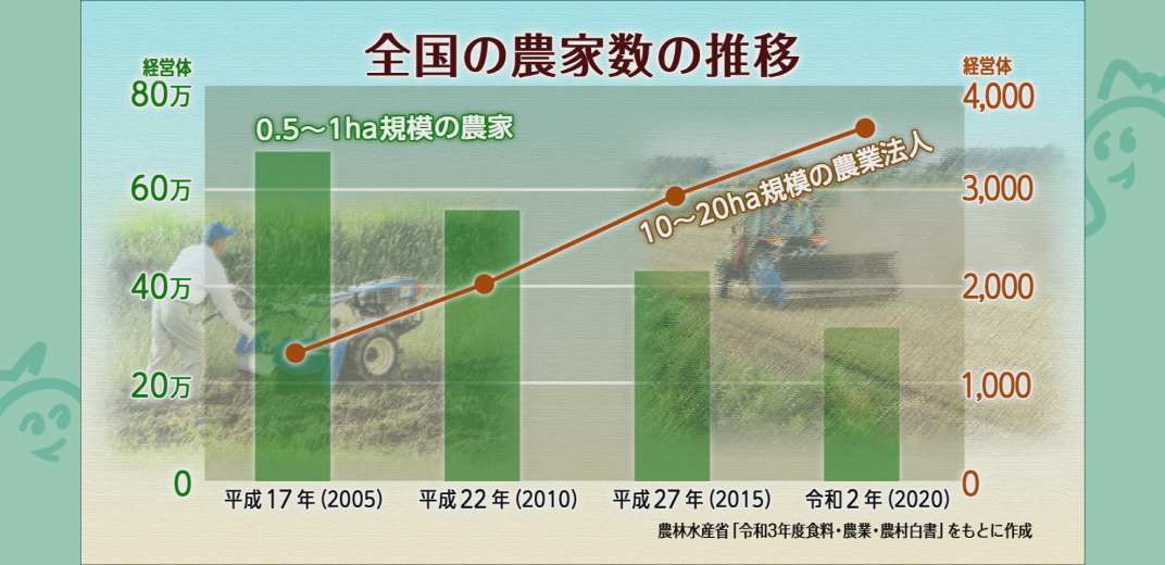その背景には、日本の農業が抱える課題があります。農家の高齢化により、作付面積が 0.5~1haの農家は半減する一方、10~20haを作付する農業法人は4倍近くに増加しています。愛知県下でも農業従事者の不足が深刻です。