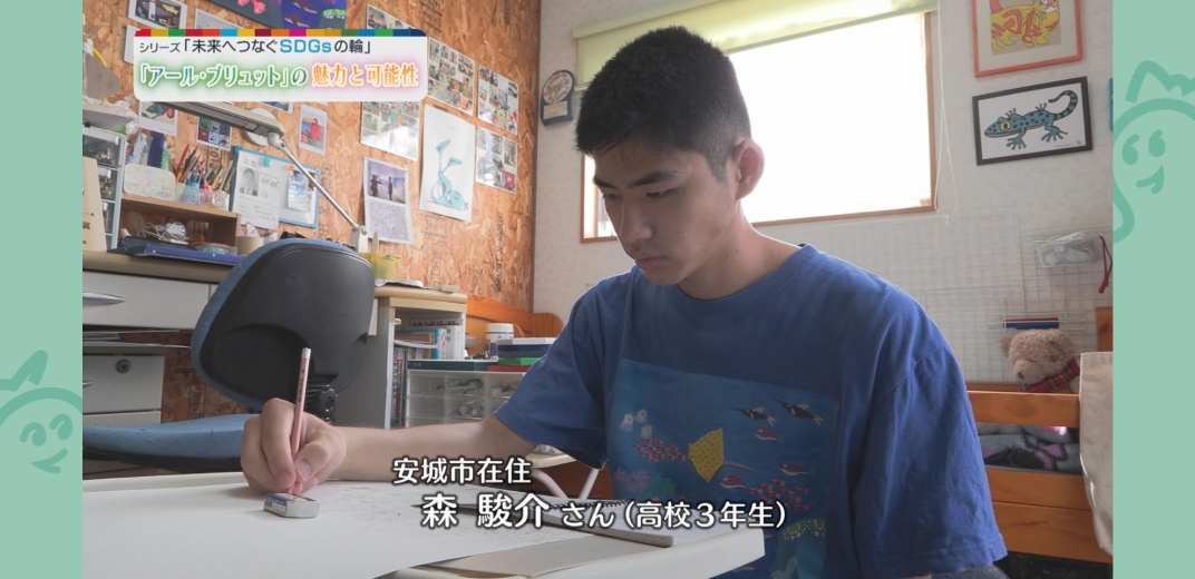 自宅で画用紙に向かい、夢中になって絵を描いているのは、NPO法人くるくるを利用している安城市在住の高校3年生、森駿介さんです。