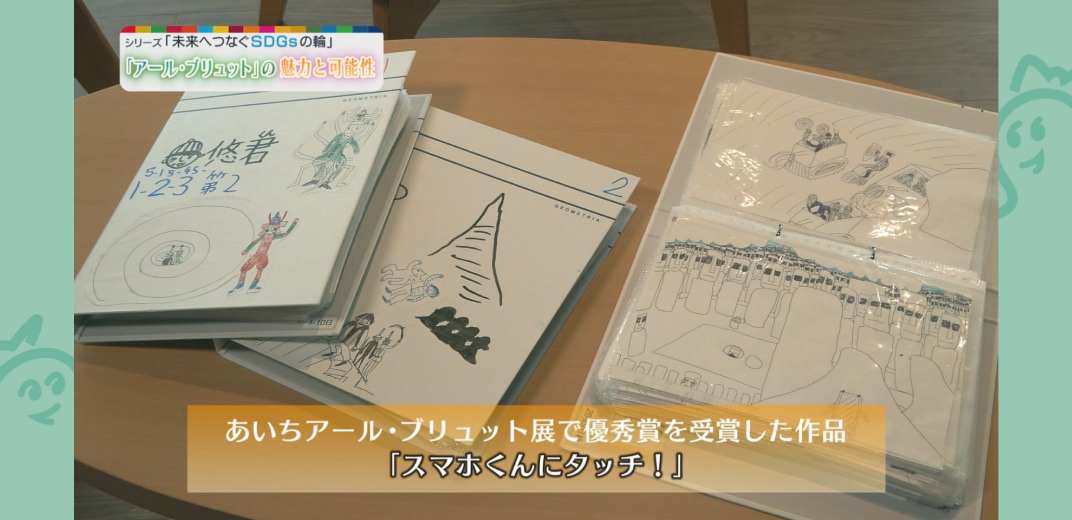 「絵を描くことが好き」と言う内田さん。内田さんは、2020年から毎年、あいちアールブリュット展に参加しています。2022年度には、内田さんが思いのままに描いた約550点をまとめた作品「スマホくんにタッチ!」が優秀賞に選ばれました。