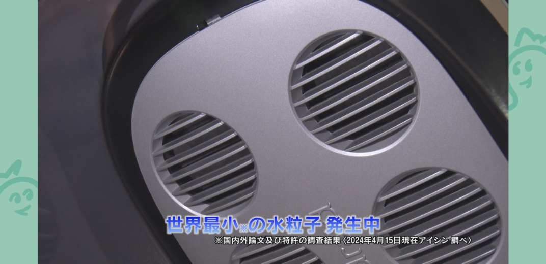 「目に見えませんが、今この機械から発生しているのがAIRです。AIRの粒子は、やかんの湯気の約600分の1の大きさですので、目には見えないですし、触れても手が濡れないという不思議な水です」