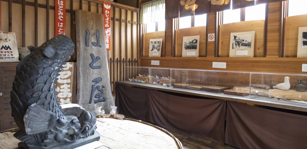資料館では、江戸時代から現在の場所で豆味噌をつくり始めたはと屋の創業当時の写真や会社名にちなんで集められた「はとグッズ」、正月に取引先へ渡していたという宝船の絵などが展示されており、歴史の重みを感じることができます。