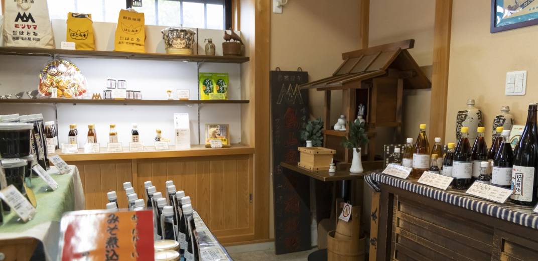 直売所では、たまり醤油や白醤油、調味料の製造販売がされています。敷地内には趣ある瓦屋根の建物が。