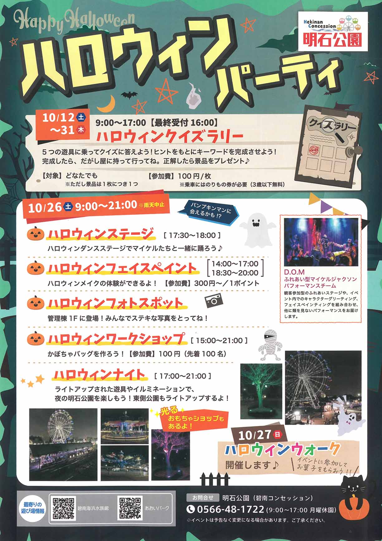 碧南市の明石公園で10月26日(土)に開催される「ハロウィンパーティー」では、ダンサーと一緒に踊れるステージや、かぼちゃバッグを作れるワークショップなど、親子で楽しめるイベントが開催されます。