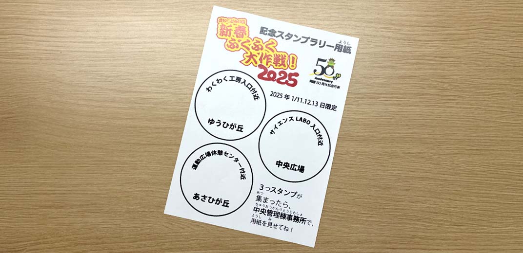 1月11日(土)~13日(月祝)の3日間開催されるスタンプラリー。園内に設置された3つのスタンプをすべて集めると、愛知こどもの国開園50周年を記念したオリジナルグッズがもらえます!