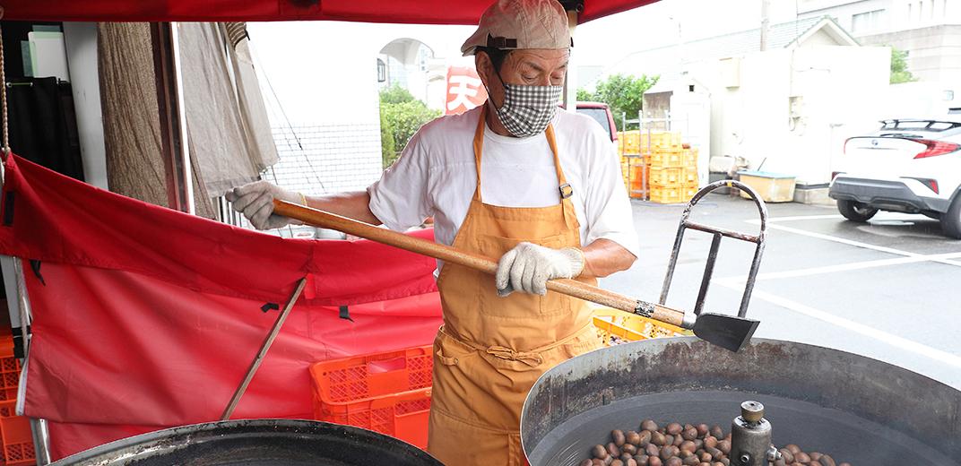 「しつこくない甘さだからずっと食べていられる」、「やさしい甘さがおいしい」と評判で、「岐阜など遠方からわざわざ買いに来てくれるリピーターさんも多いんです」と教えてくれたのは、衣浦食品スタッフの小林高志さん。店先にある釜から常に甘栗を焼く香ばしい香りが漂ってきて、食欲をそそります。