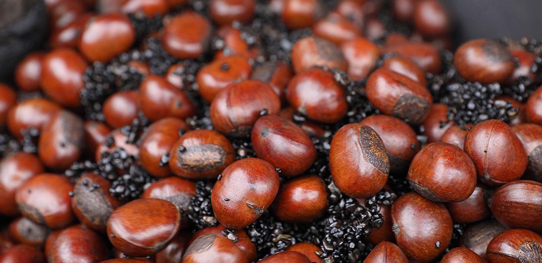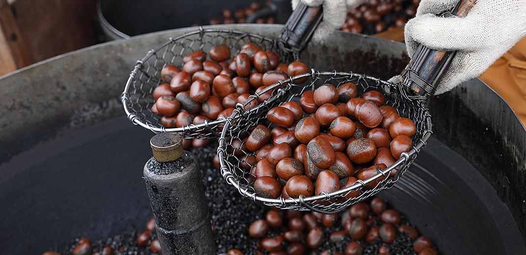 焼きあがった栗はつやつや、ピカピカしていておいしそう!焼くのにはおよそ1時間かかり、その間ずっとかき混ぜたりする労力や、石焼と同程度の高温環境を作り出さなければならないことを考えると、家庭で作るのはなかなか大変といえそうです。
